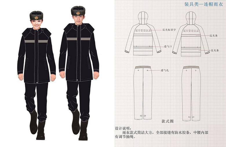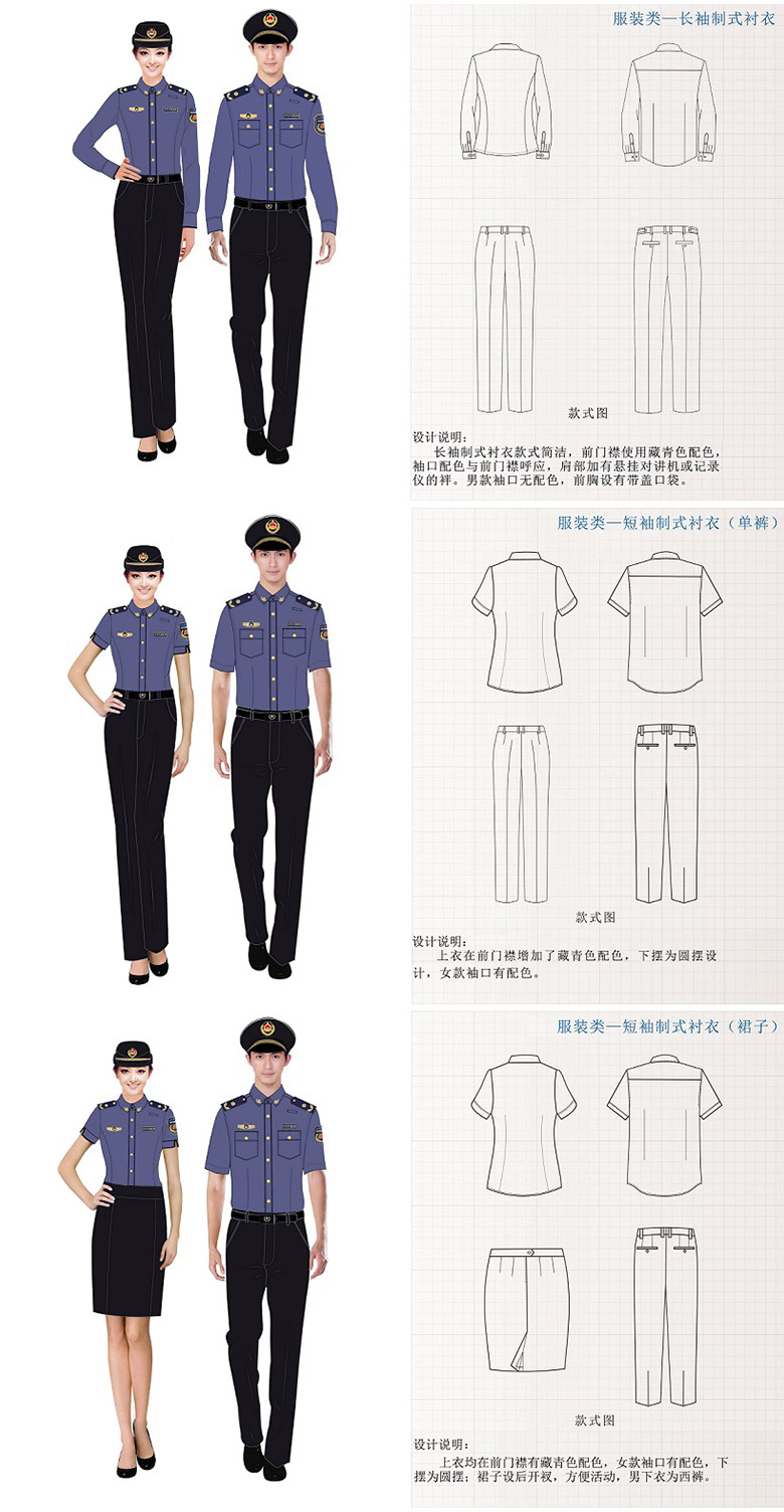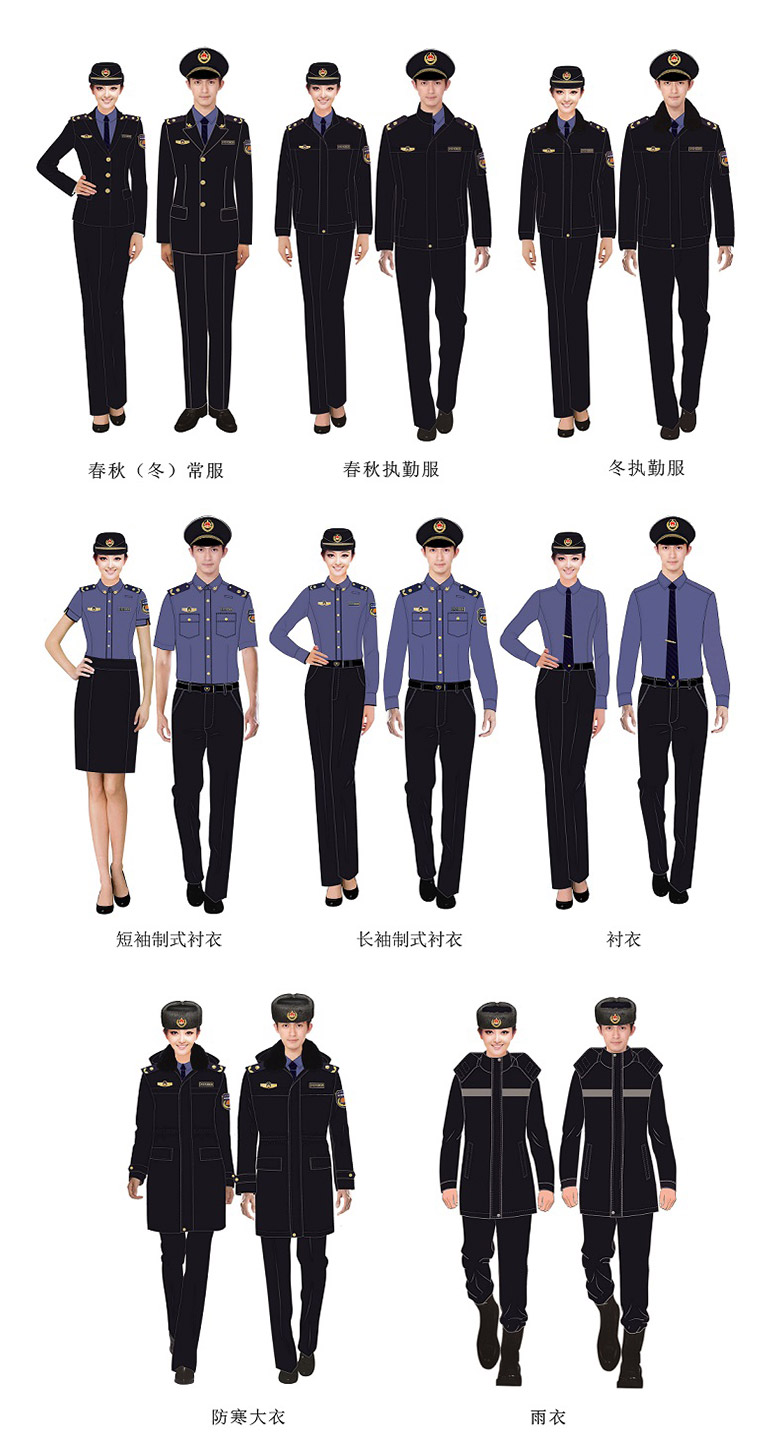 服裝顏色為藏青色及天空藍色,搭配金色標志。服裝功能主要考慮適應(yīng)城市管理執(zhí)法工作場所多在戶外、街頭的實際,便于執(zhí)勤活動。另外,《辦法》起草過程中,住建部還參考了公安、工商、食藥監(jiān)、海關(guān)等統(tǒng)一著裝部門的經(jīng)驗做法,先后赴北京、西安、長沙、成都、??凇⒑诤拥?4個城市進行了調(diào)研,范圍覆蓋了熱區(qū)、亞熱區(qū)、南溫區(qū)、北溫區(qū)、寒區(qū)、高寒區(qū)等全部6個氣候區(qū)域,明確制服和標志標識的供應(yīng)種類為帽類、服裝類、鞋類、標志標識類、裝具類5大類18小類。